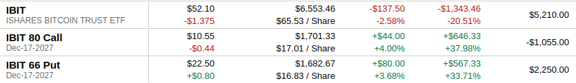 A much better trade happens when you go further out the expiry window. In the example above, a purchase of 100 shares at $65.53 along with the sale of a CALL contract for Dec 17, 2027 $80 strike for $17.01 along with a simultaneous purchase of a $66 put for $16.83. Note that in this example I bought IBIT at $65.54 but bought the right to sell it at $66 come December 17, 2027. This trade has a true net credit for the collar because there is no way to lose money on this trade. I bought at $65.54 and can sell at $66 and still made a profit on the options collar ($17.01 – $16.83) = $0.18 x 100 = $180. I have the right to sell it at $66 so $66 – $65.54 = $0.46 x 100 = $46. Total profit here is $226 minimum. We’ll need to wait till Dec 17 2027 to find out how high or low IBIT will go.