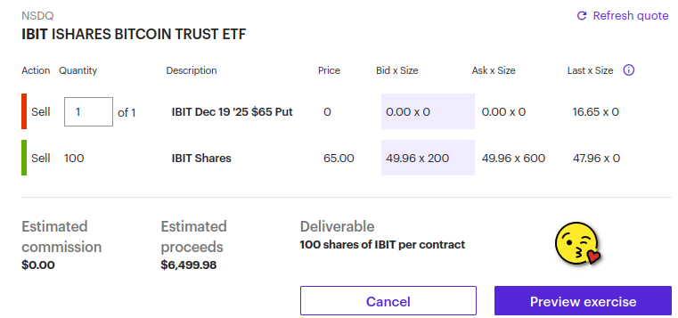 This and similar trades are all part of using net credit collars to avoid or minimize losses. IBIT is currently trading at $49.75 and I am forcing someone to buy 100 shares at $65 so does that make me a Grinch?